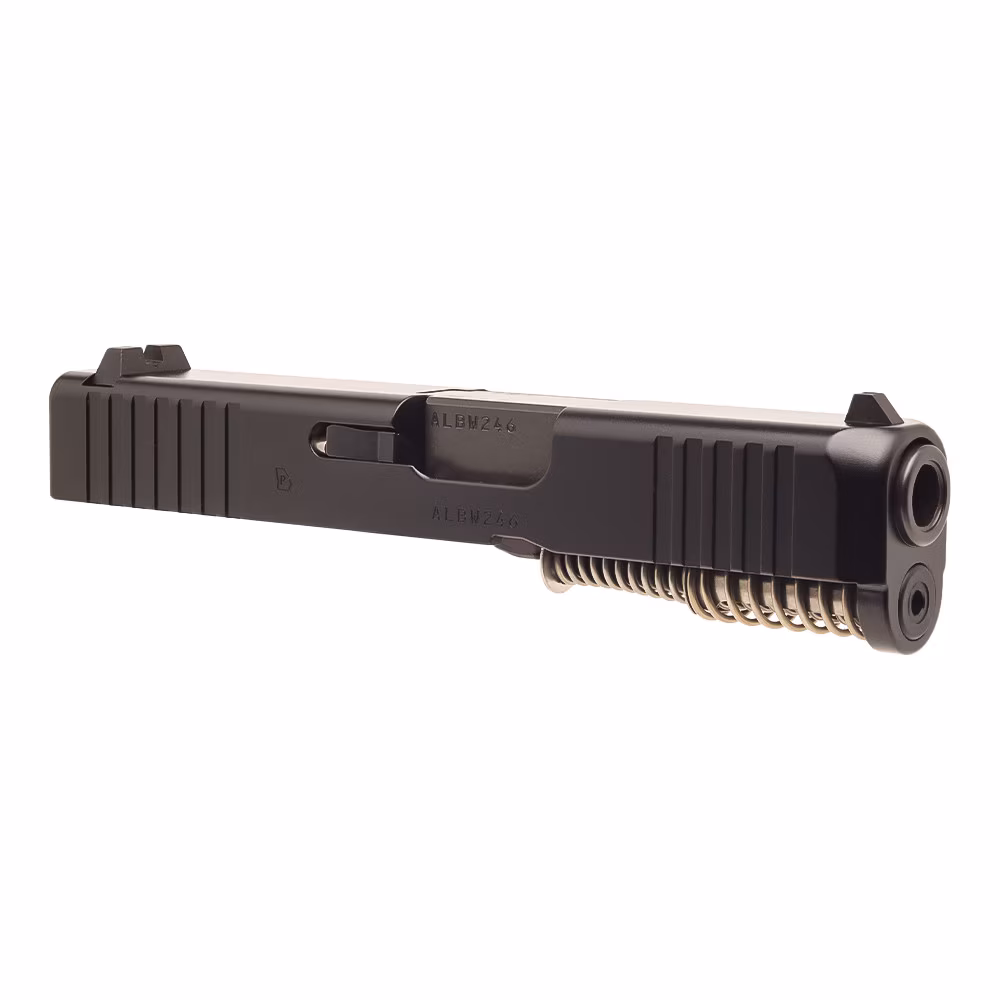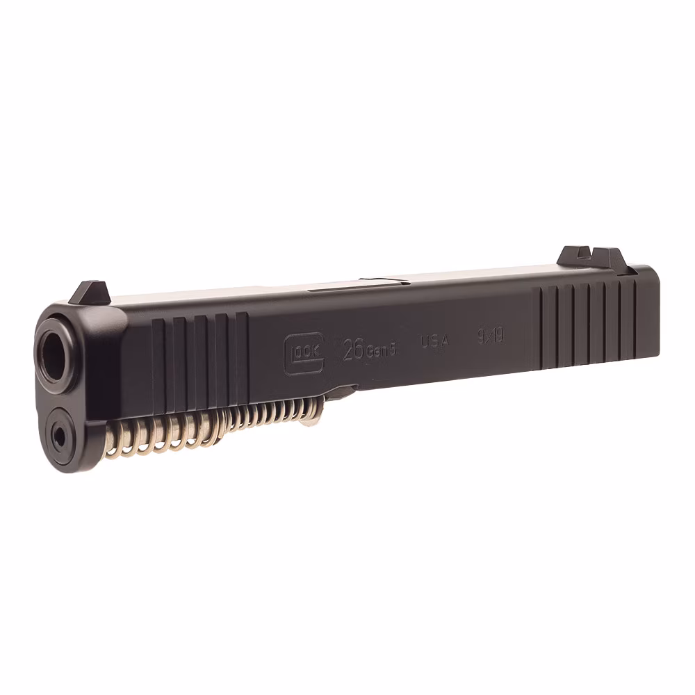 A complete OEM slide ships fully assembled and ready to install on a compatible Glock 26 Gen 5 frame. It typically includes: